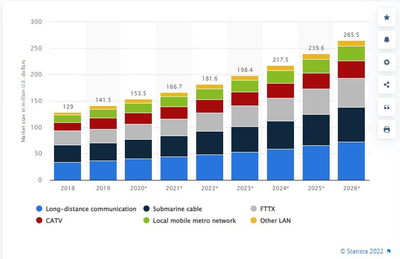 这篇报道为外界了解俄罗斯光通信发展透露出一点信息。关于俄罗斯的光通信市场,一家市场咨询公司曾经给出2026年前的市场预测。按他们的数据,每年20多亿美元的市场对于那么大一个国家来说实在不算高。不过,以笔者所知,早些年国内不少光通信公司都在俄罗斯市场有不错的发展,这些年可能由于俄罗斯国内经济困难,光通信的建设放缓了。